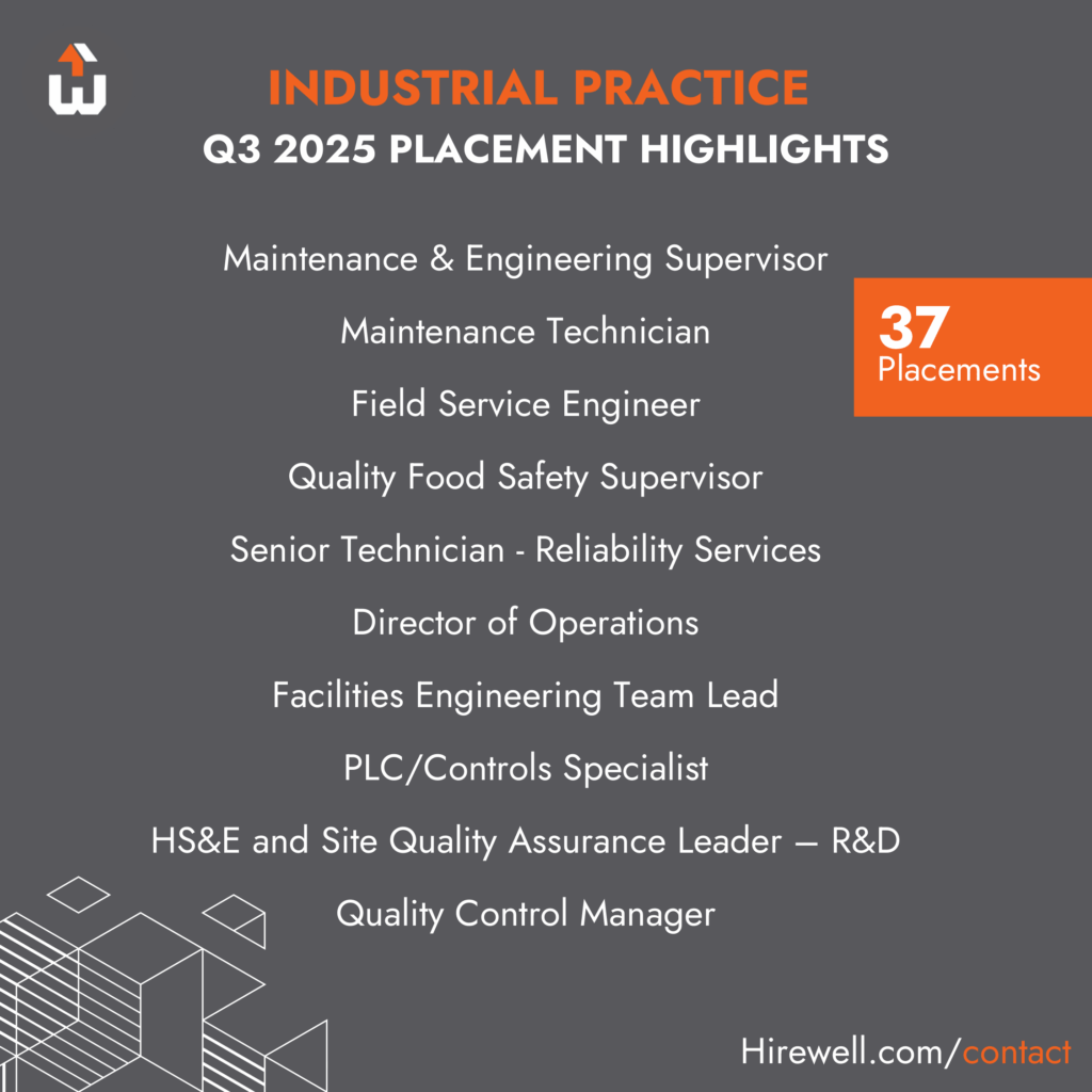 Our Industrial Practice had a strong Q3 with 37 placements across engineering, operations, and quality. Demand remains high for both hands-on technical expertise and strategic leadership, especially as companies navigate cost pressures, talent shortages, and evolving production needs. We filled a variety of roles in Q3, reflecting the range of talent organizations are relying on right now.
